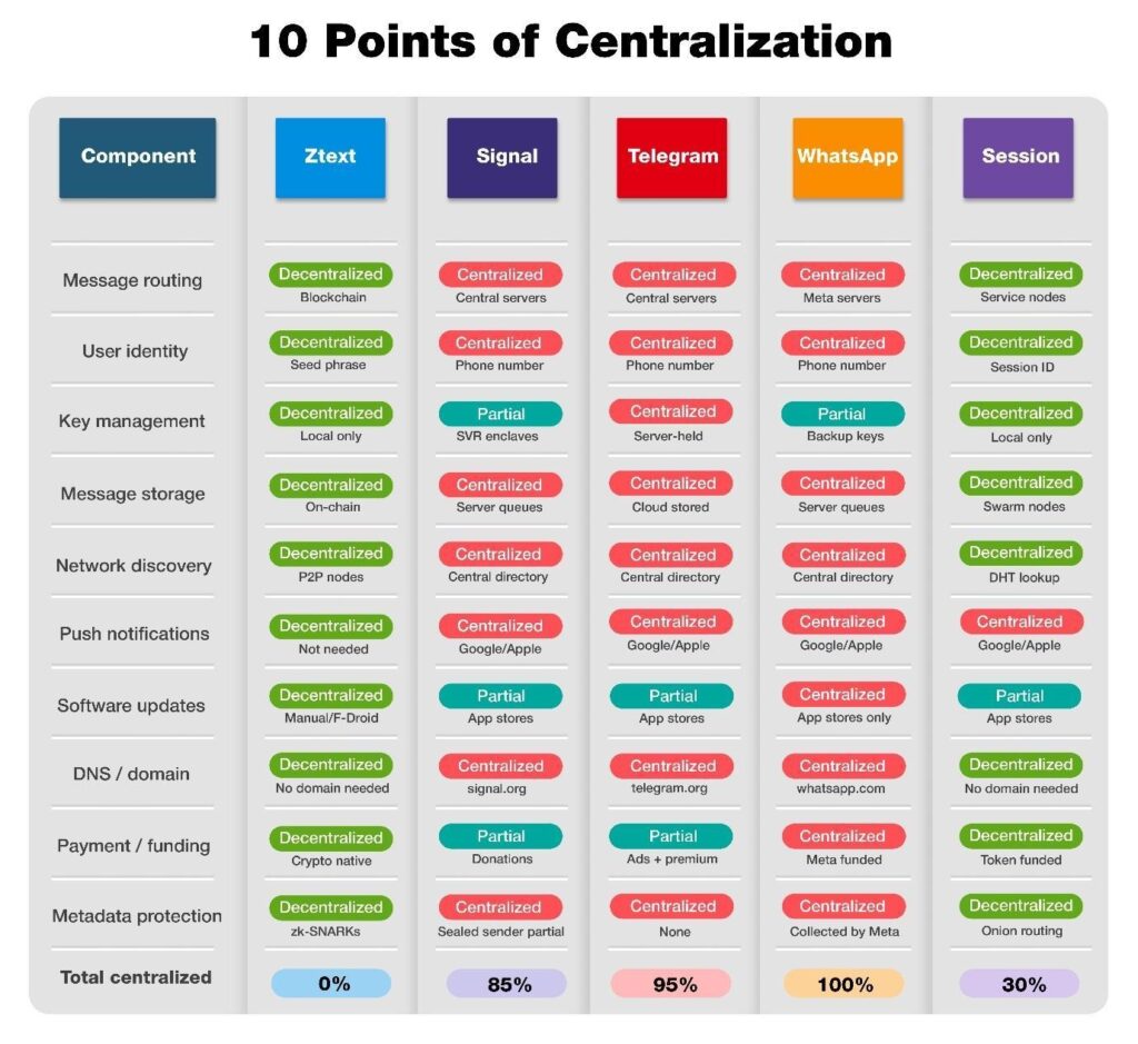 The team behind Z-text did something refreshing: they actually measured the competition. They identified 15 critical privacy failure points and 10 points of centralization across the biggest messengers.